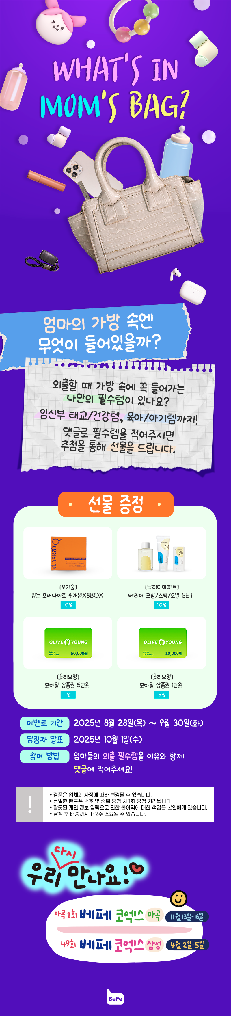 제 가방 속 필수템은 바로 베페에서 구매한 아기 물티슈와 손수건이에요! 외출할 때마다 아기 침, 음식, 기저귀 갈이까지 해결해주는 만능템이라 분신처럼 들고 다닌답니다. 이번 삼성 코엑스 베페에서 직접 구매해서 사용해 보니 품질도 만족스럽고, 가격도 착해서 정말 알차게 득템했어요~~ 작은 물티슈와 손수건이지만, 우리 가족 외출의 평화와 행복을 지켜주는 ‘슈퍼히어로 아이템’이랍니다^~^ 다음 베페에서도 또 좋은 제품들을 만날 수 있을 거라 기대돼요!
